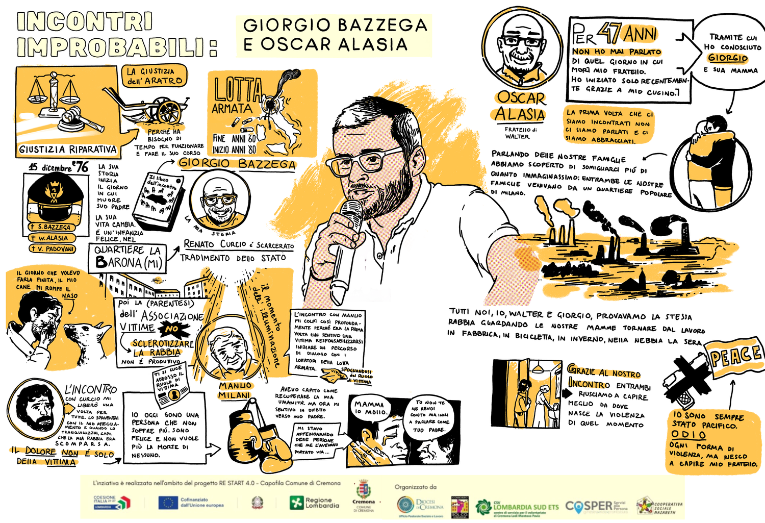 Questi eventi, parte del Festival dei Diritti, hanno visto visto un dialogo con Giorgio Bazzega e Grazia Grena ed Oscar Alasia, protagonisti di un percorso nazionale di giustizia riparativa, in cui due vite si intrecciano in una comune storia di conflitto e dolore. Il compito di riassumere graficamente un racconto così forte ed emozionante è stato frutto di preparazione e discussioni, precedentemente e successivamente l’